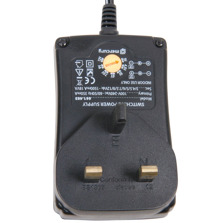 This compact, energy efficient switch-mode power supply gives up to 1500mA with a variable output from 3V to 12V. Suitable for most low power electronic products such as MP3 players, PDA etc.