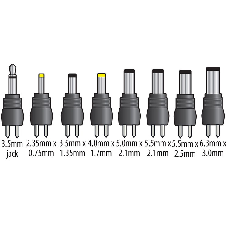 Adaptor plugs 3.5mm jack, 2.35 x 0.75mm, 3.5 x 1.35mm, 4 x 1.7mm, 5 x 2.1mm, 5.5 x 2.1mm, 5.5 x 2.5mm, 6.3 x 3mm