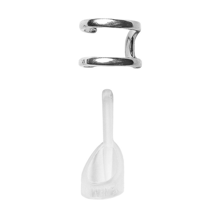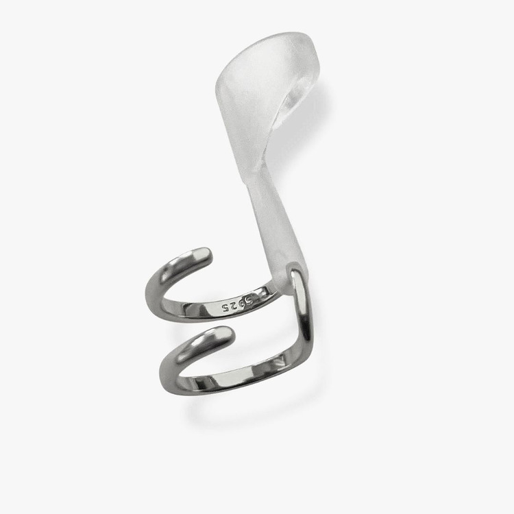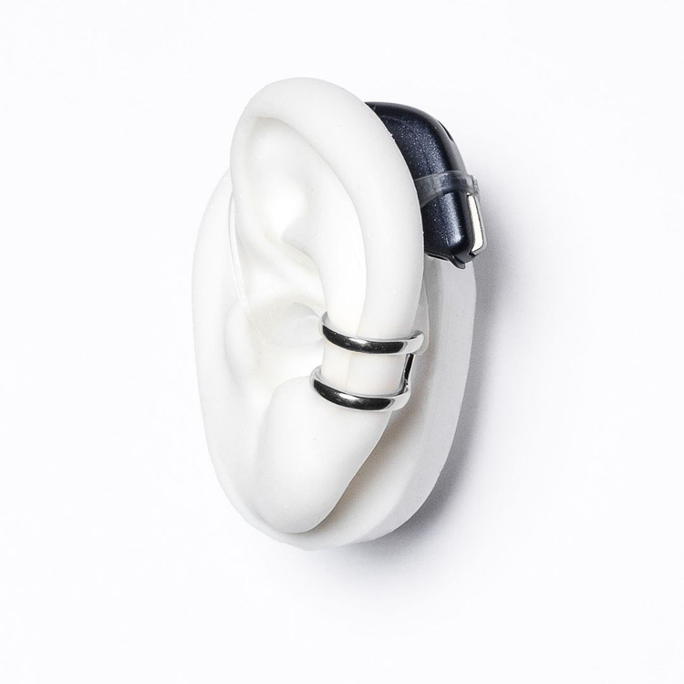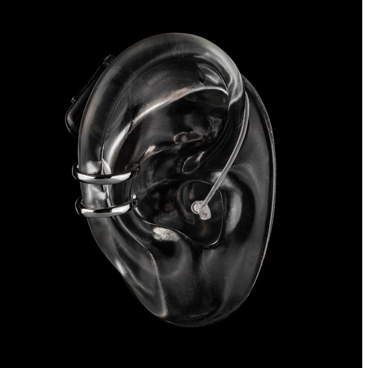 Double Ring Silver is a double Deafmetal Safety Ring ear cuff. Deafmetal Safety Rings loop through the Deafmetal Holster to keep hearing aids securely in place, no piercings required.